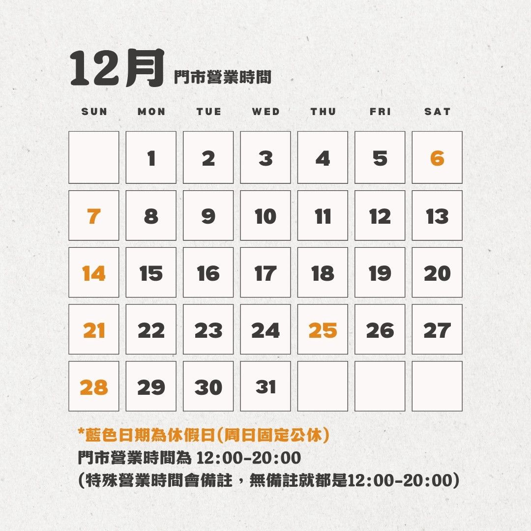 ✅ 門市營業時間:12:00-20:00 (特殊營業時間會備註,無備註就都是12:00-20:00)