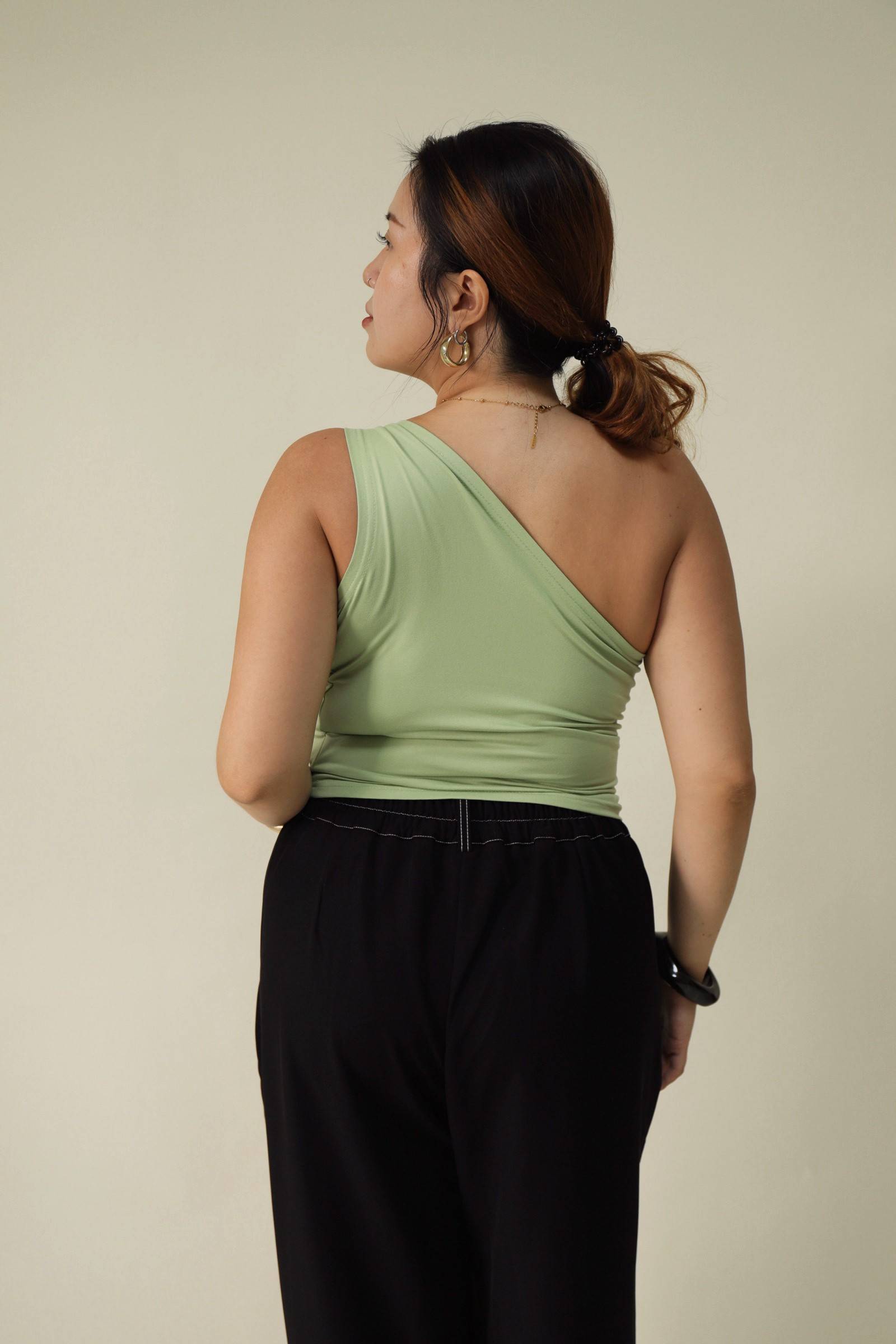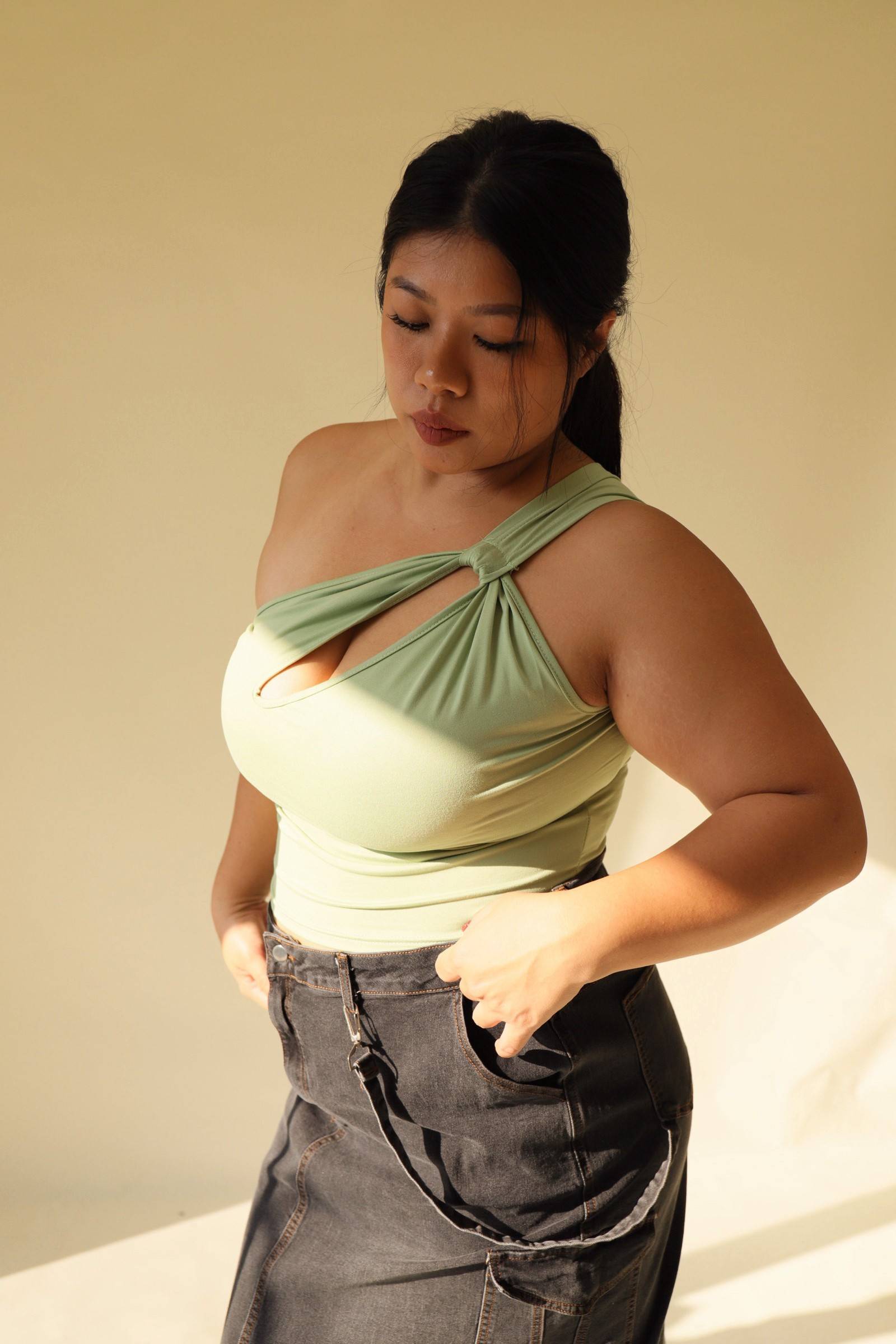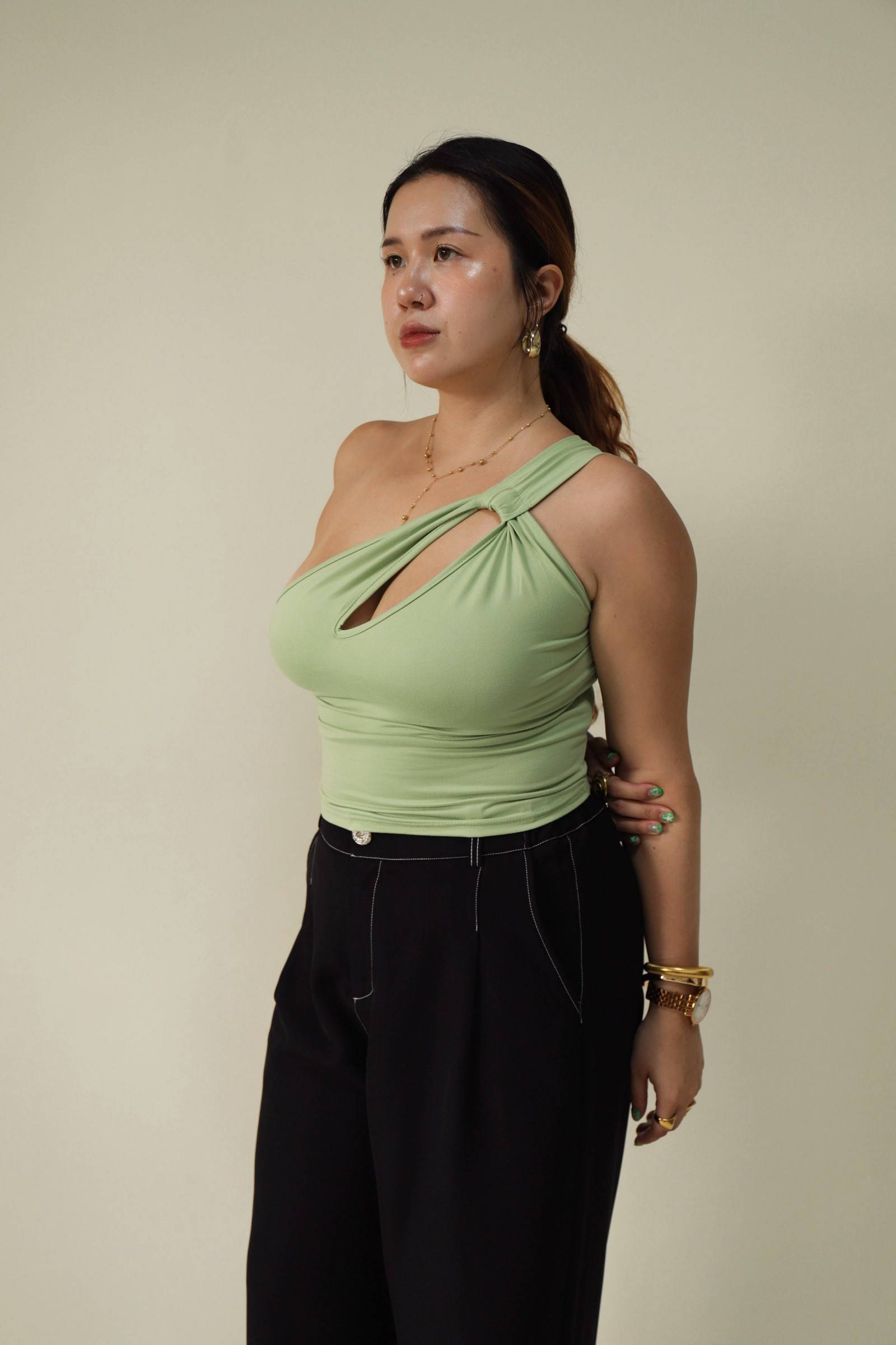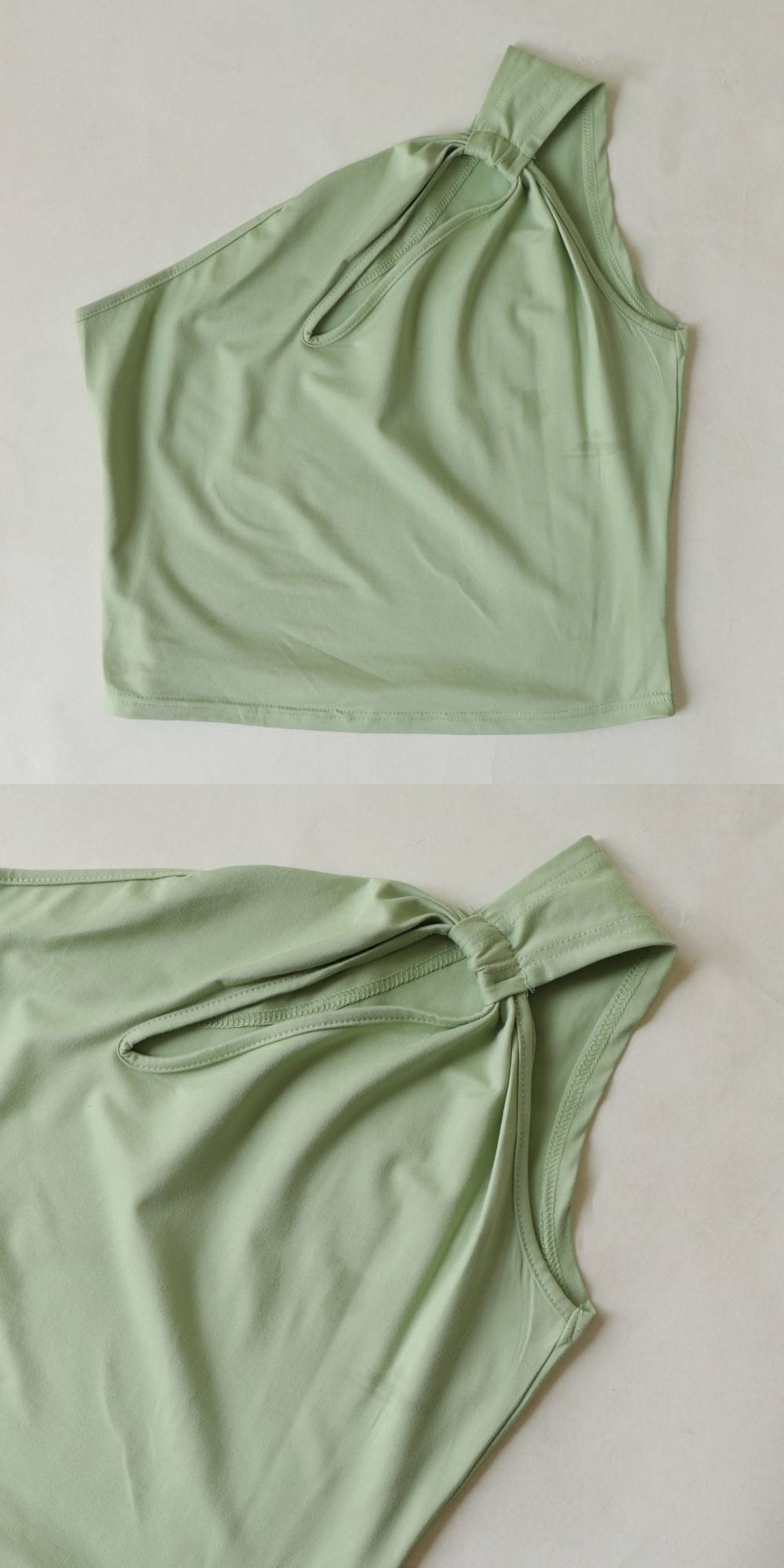 單肩小開洞酪梨綠上衣