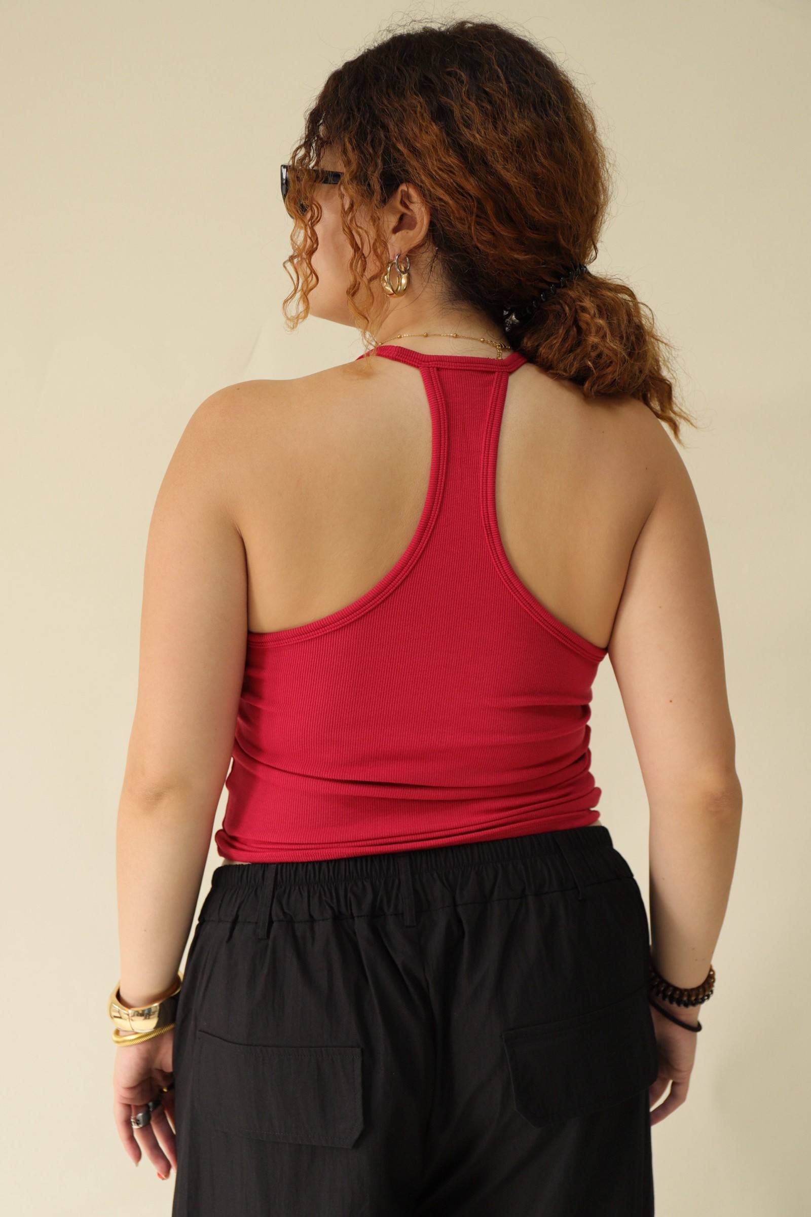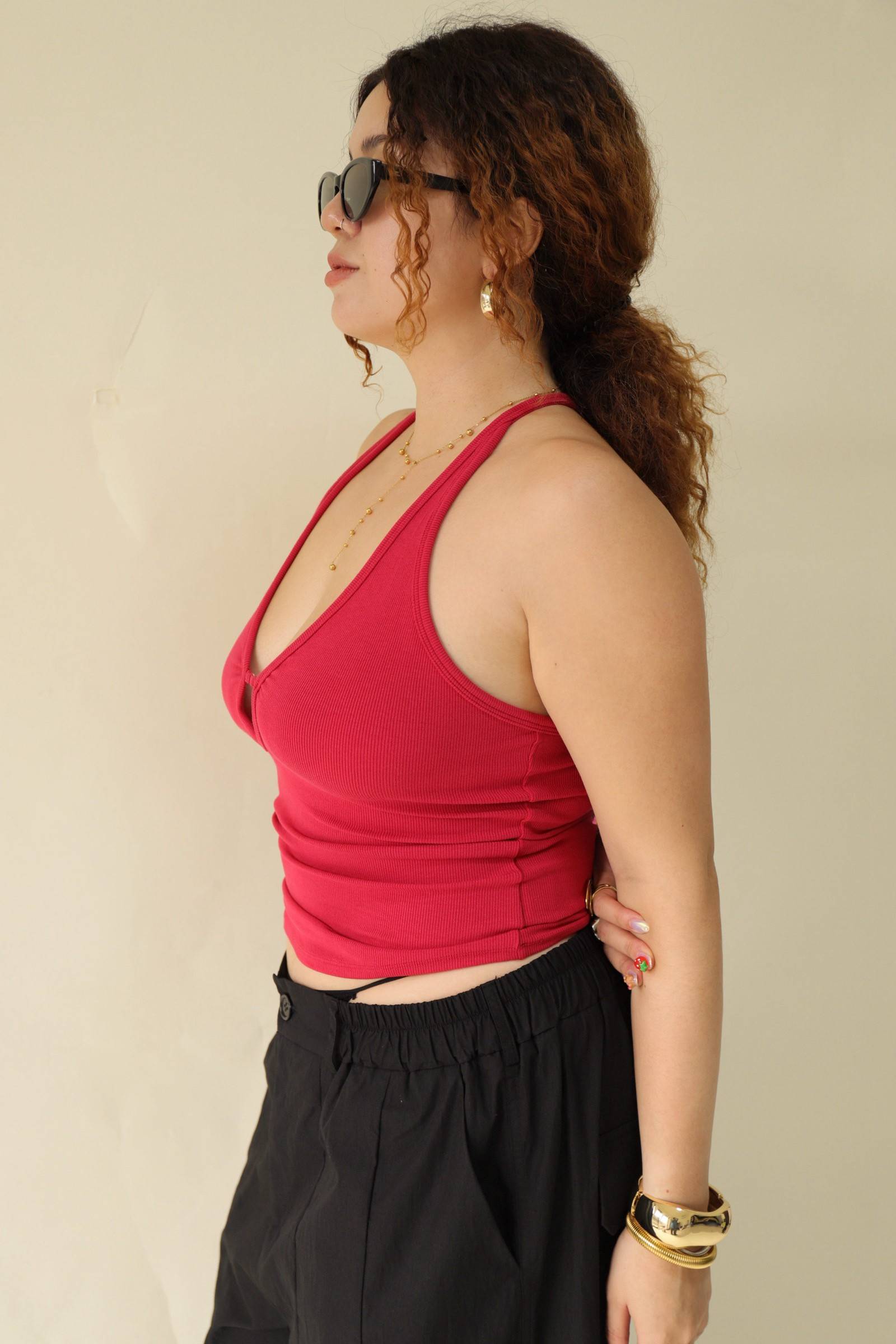 大鏤空掛脖彈力背心(紅)