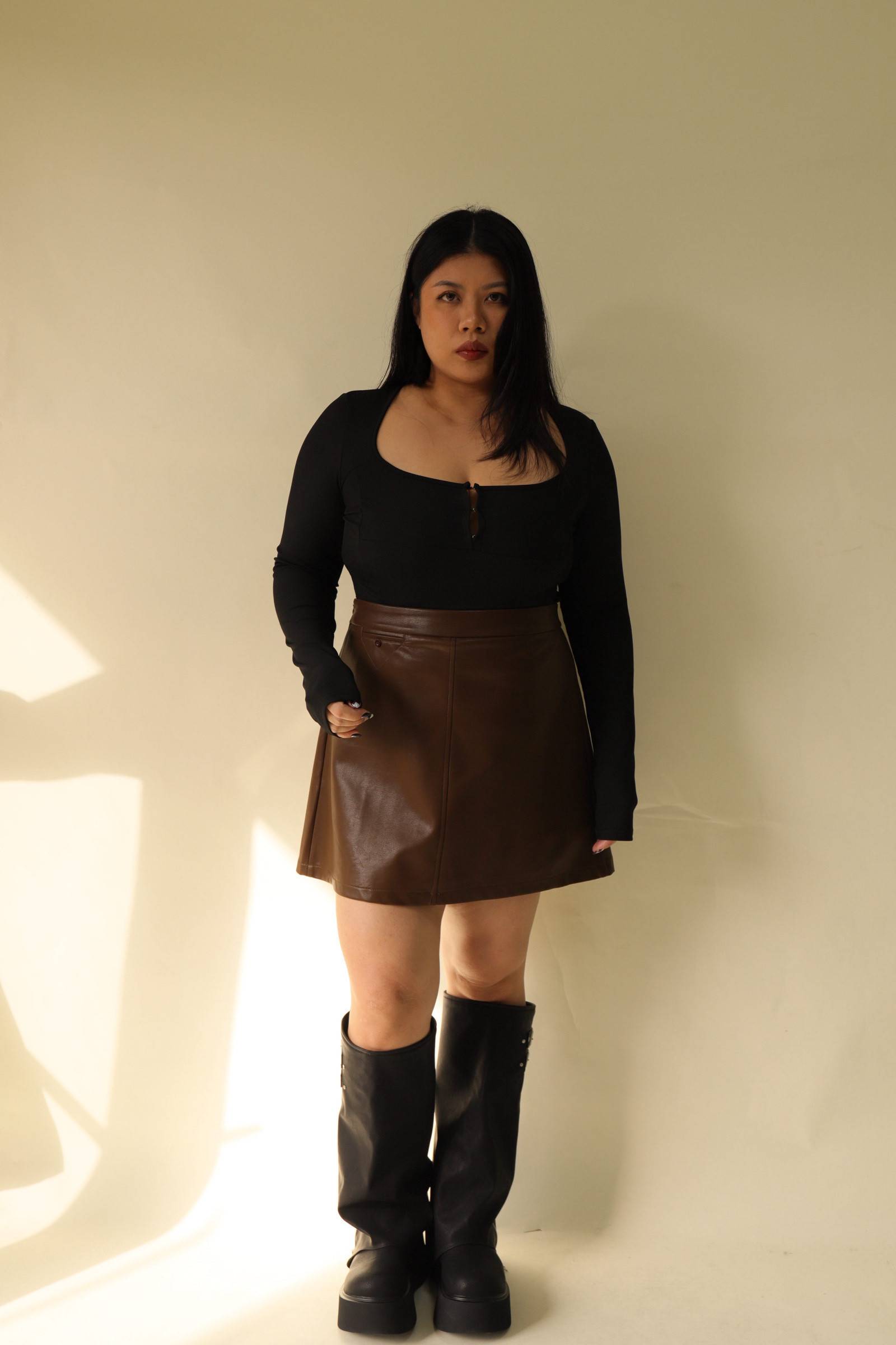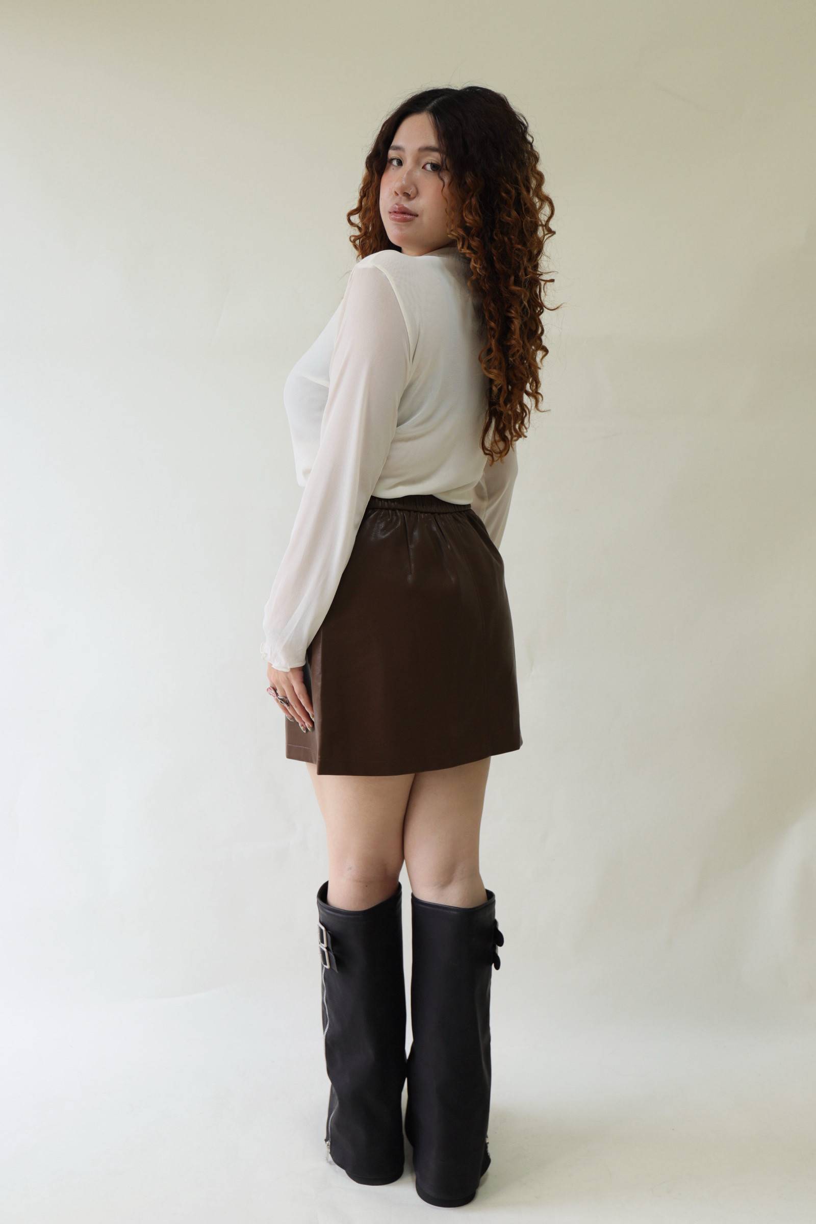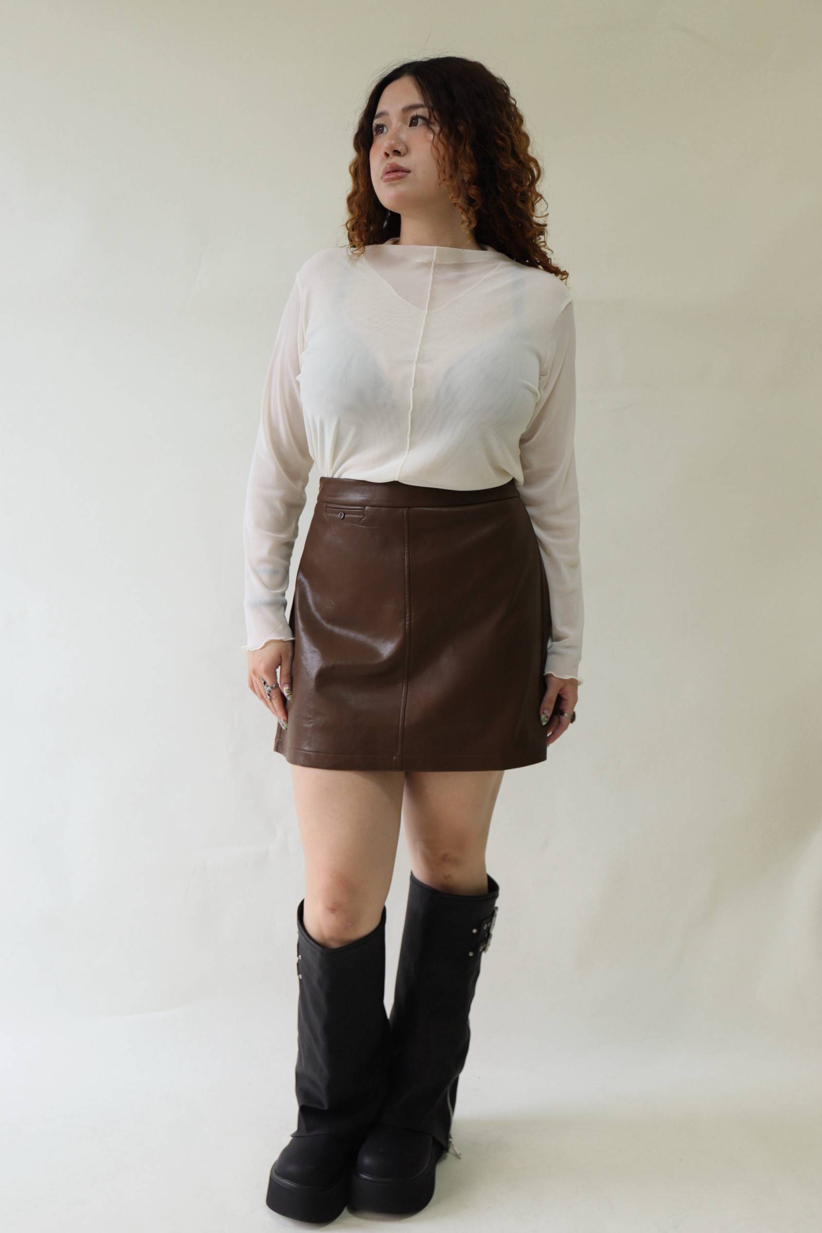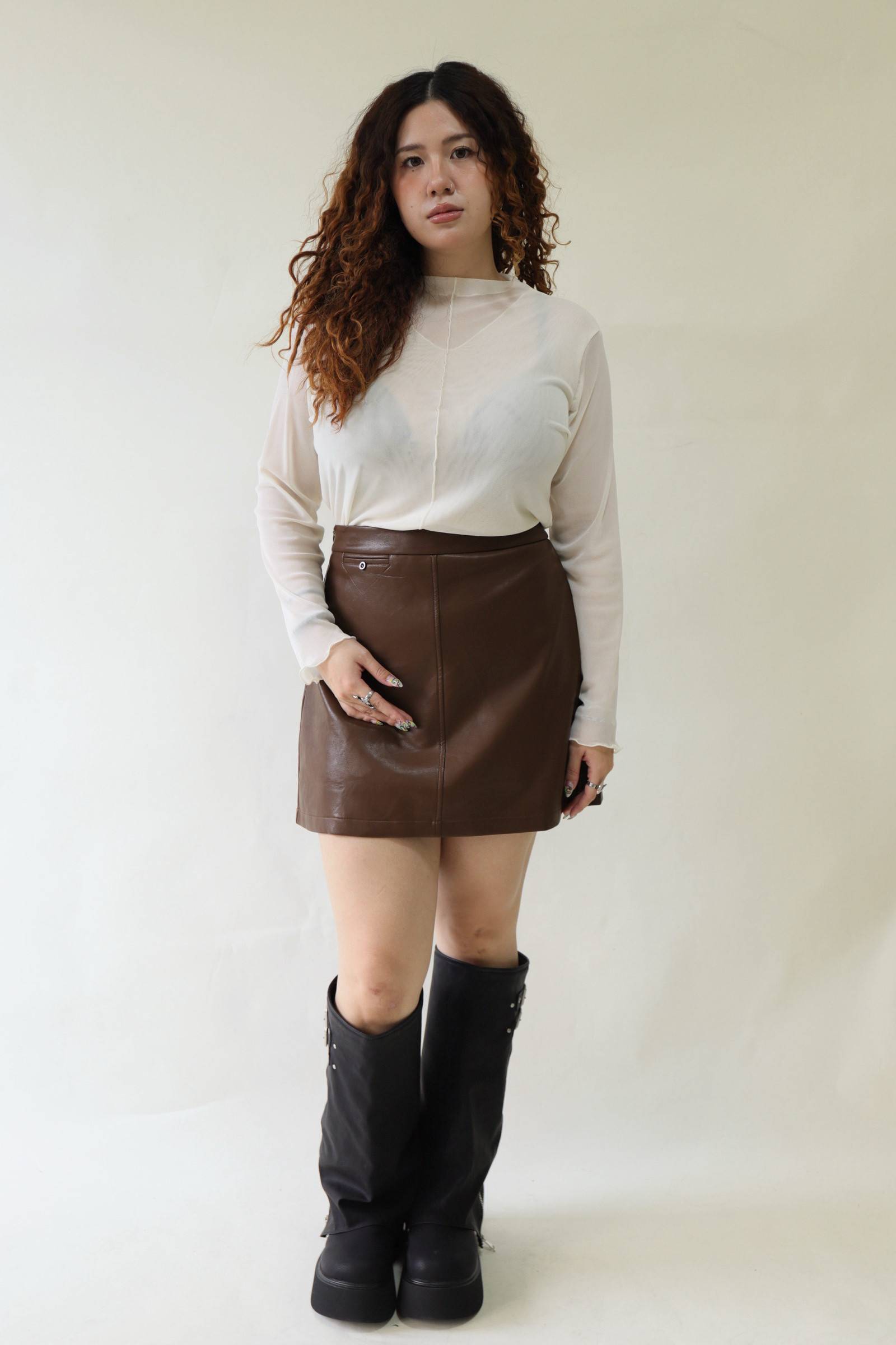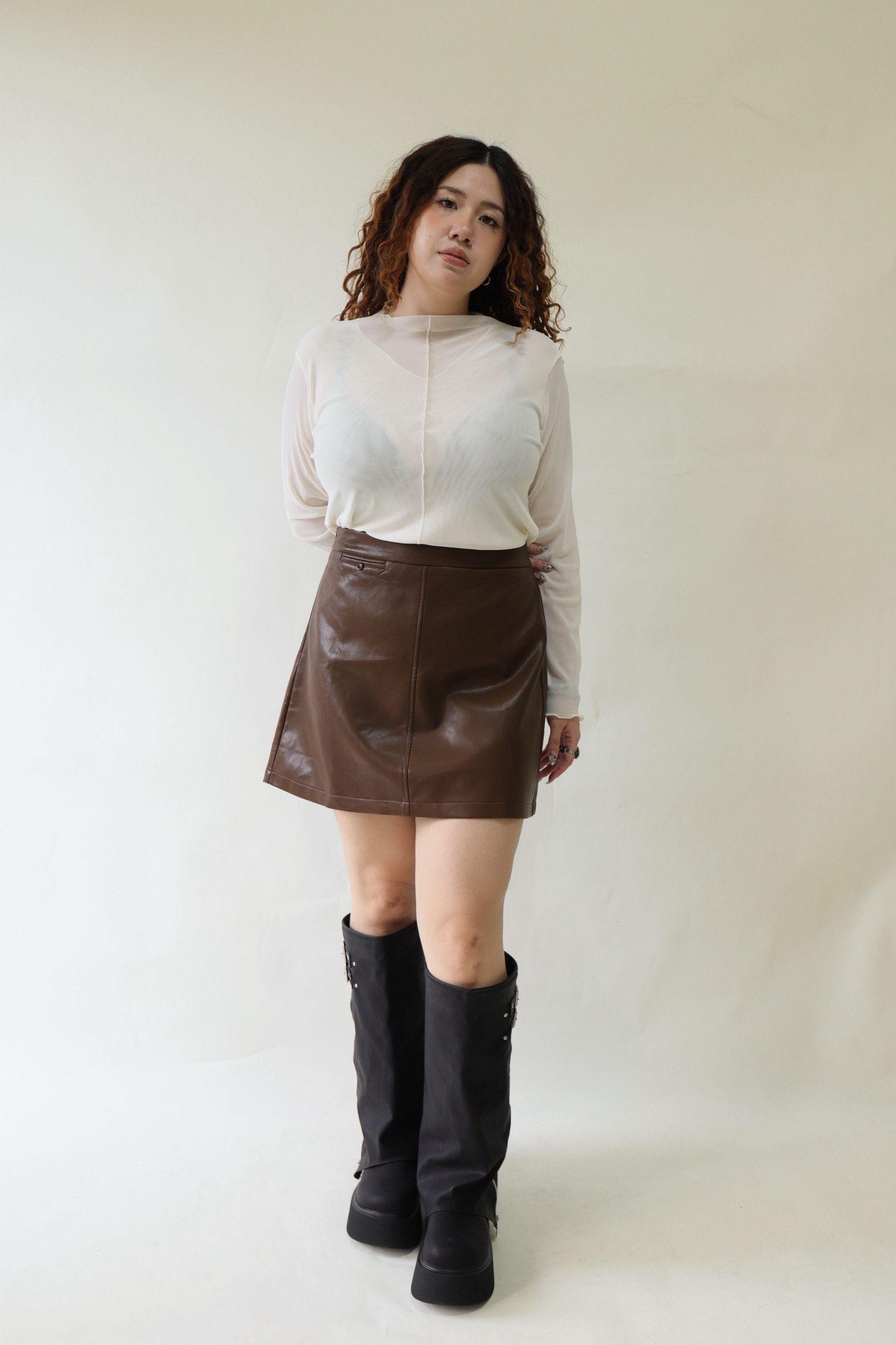 【EASE】時髦摺線高腰皮裙-咖,LEILASHAW 你的美不該被數字綁架