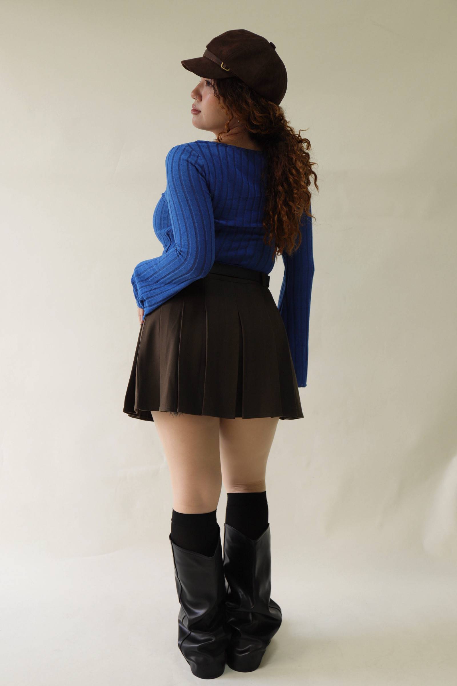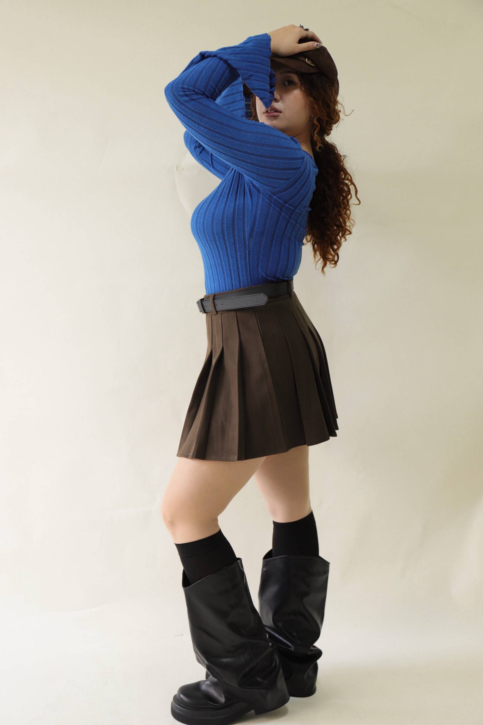不顯胖毛呢百摺短裙(附皮帶)-咖