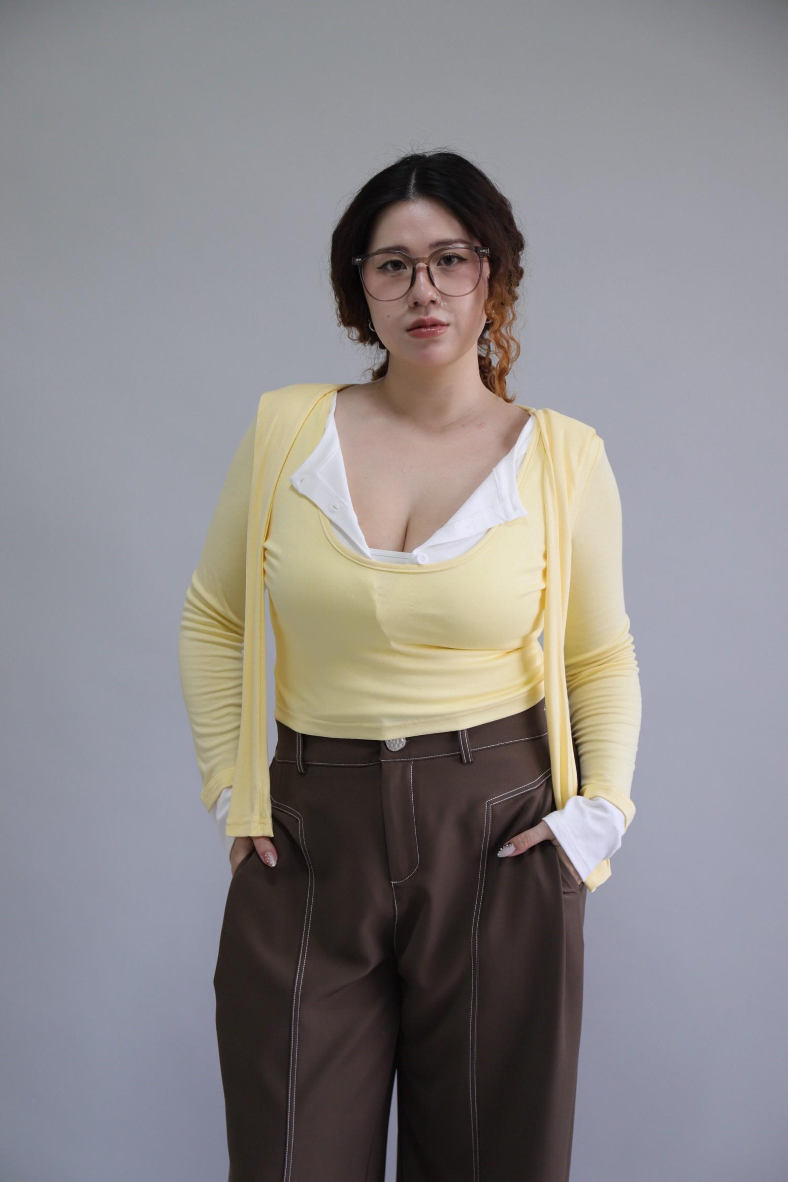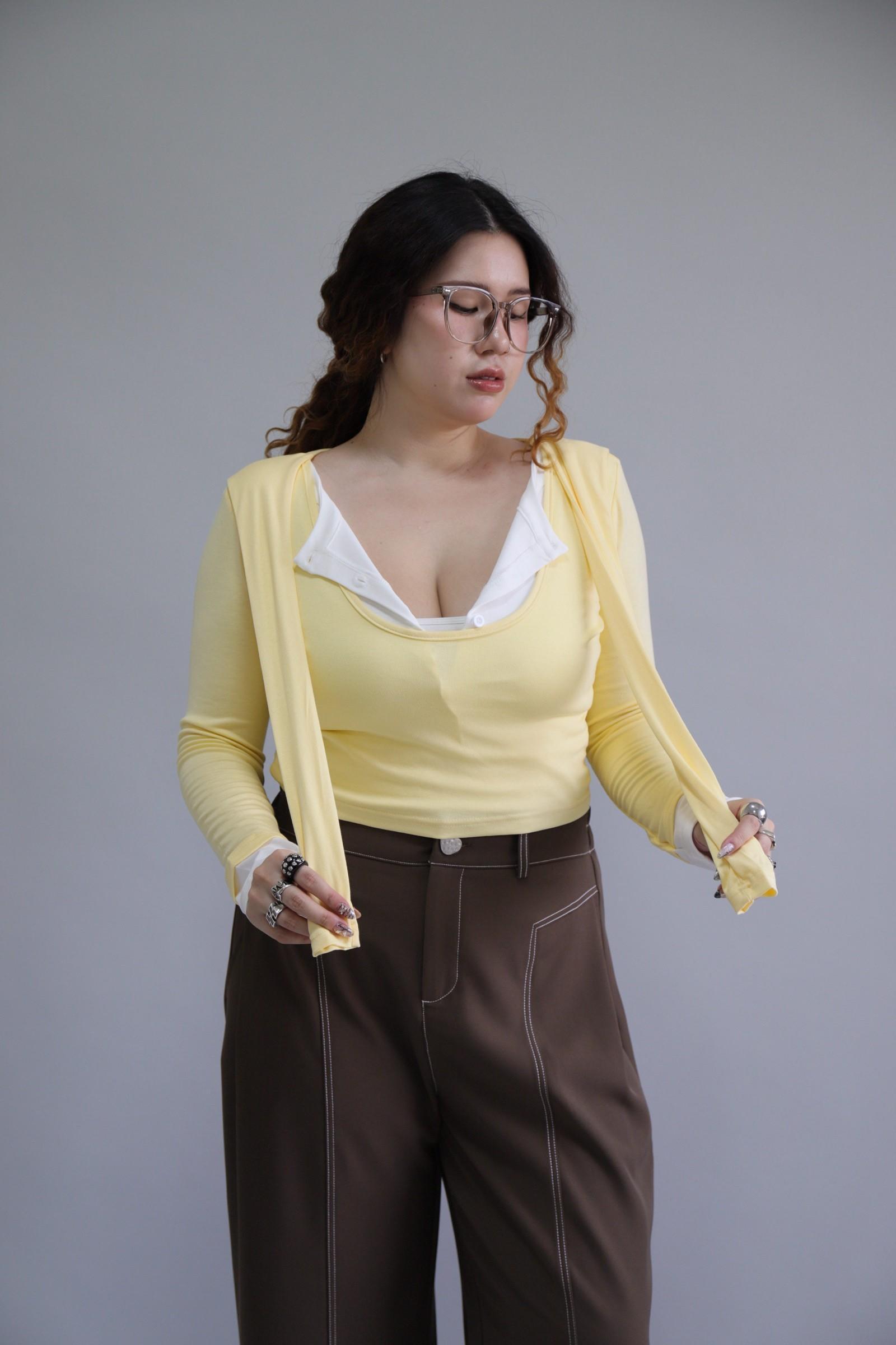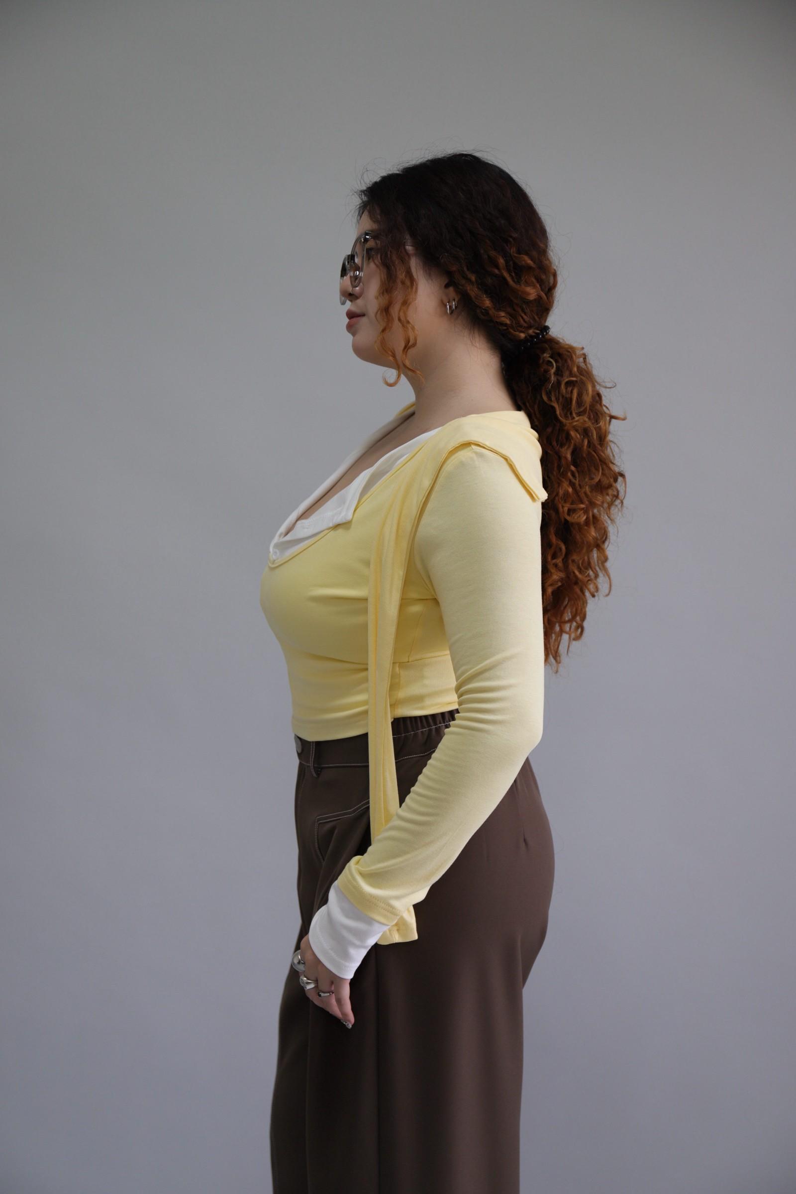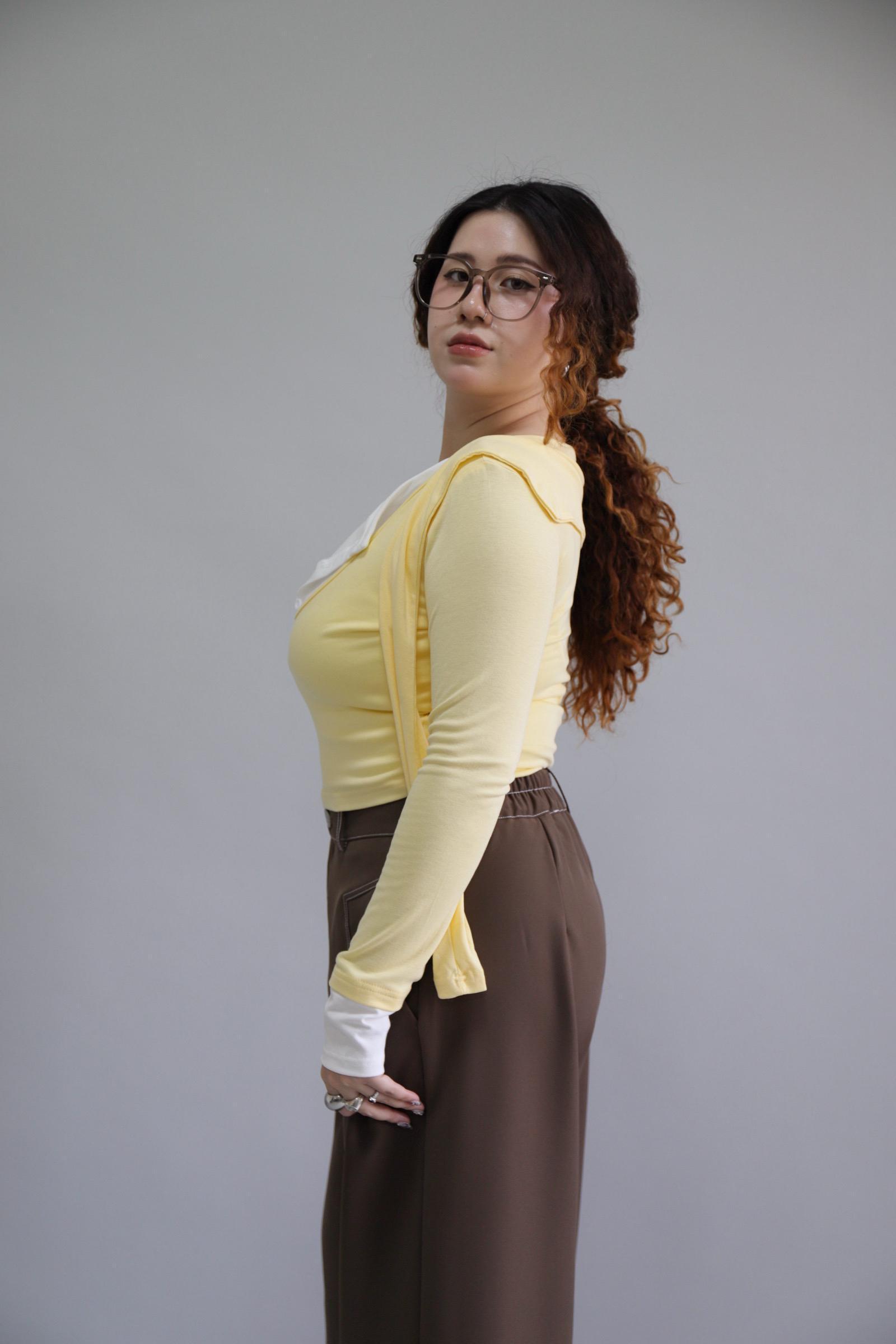拼接撞色假兩件上衣-奶油黃,LEILASHAW 你的美不該被數字綁架