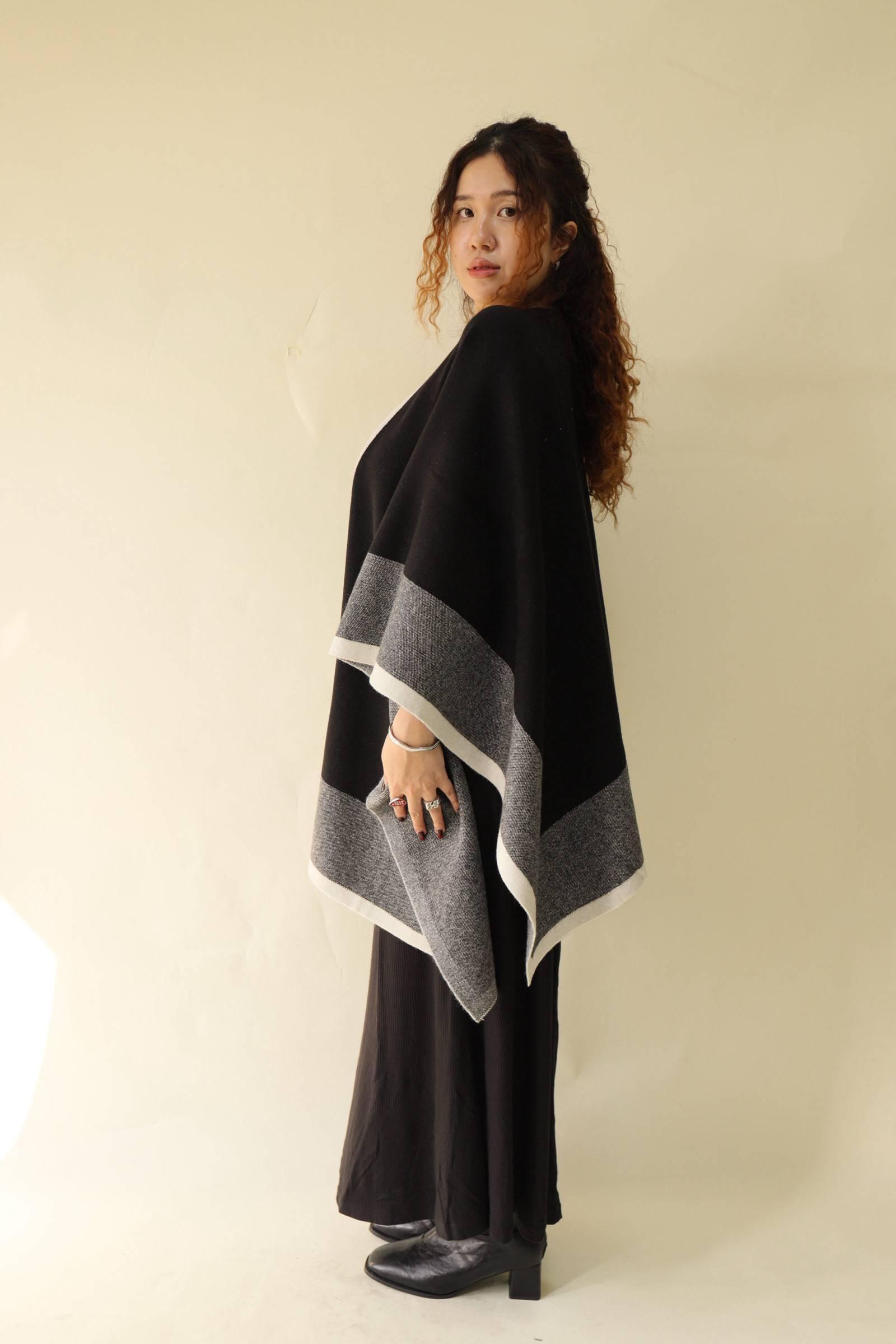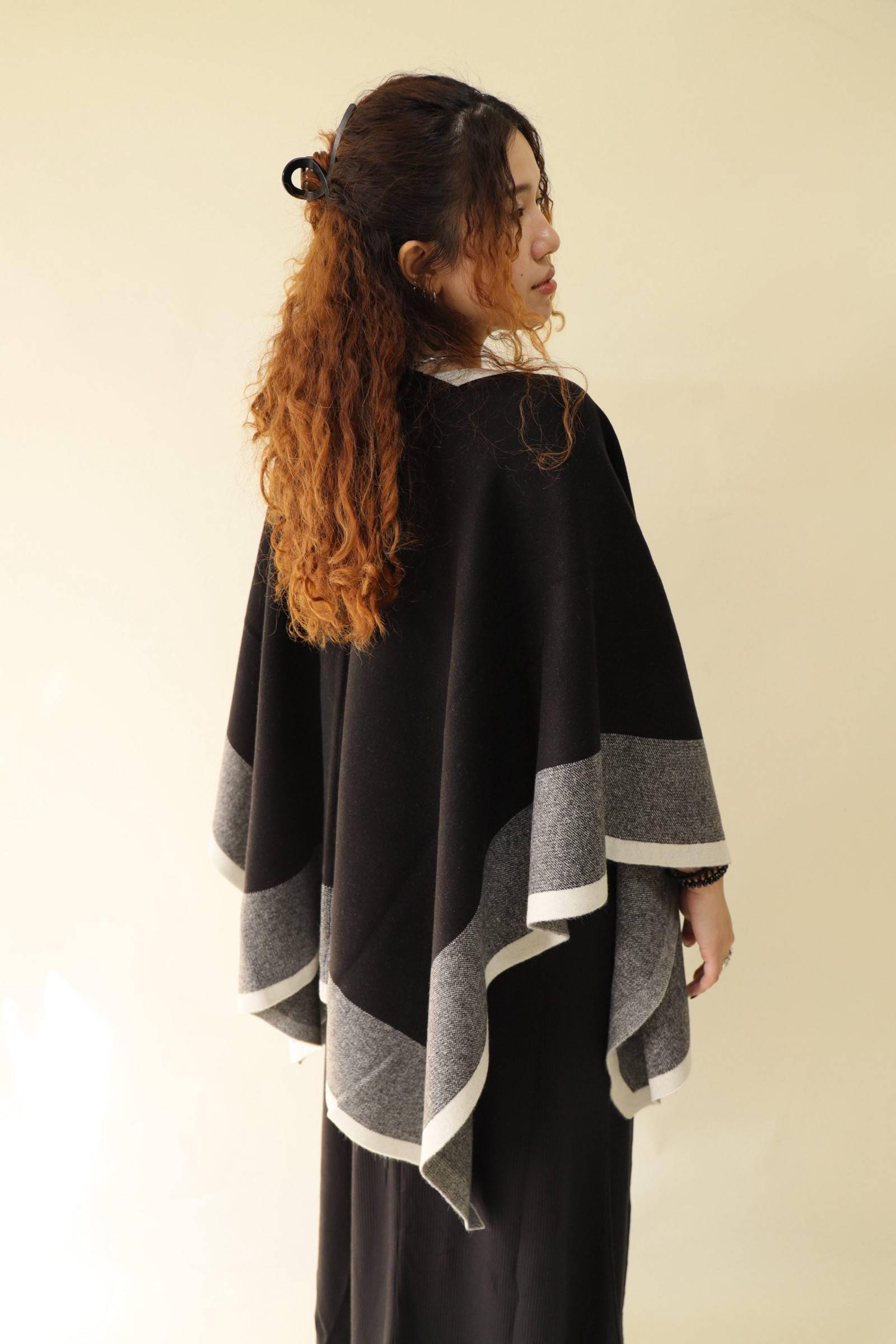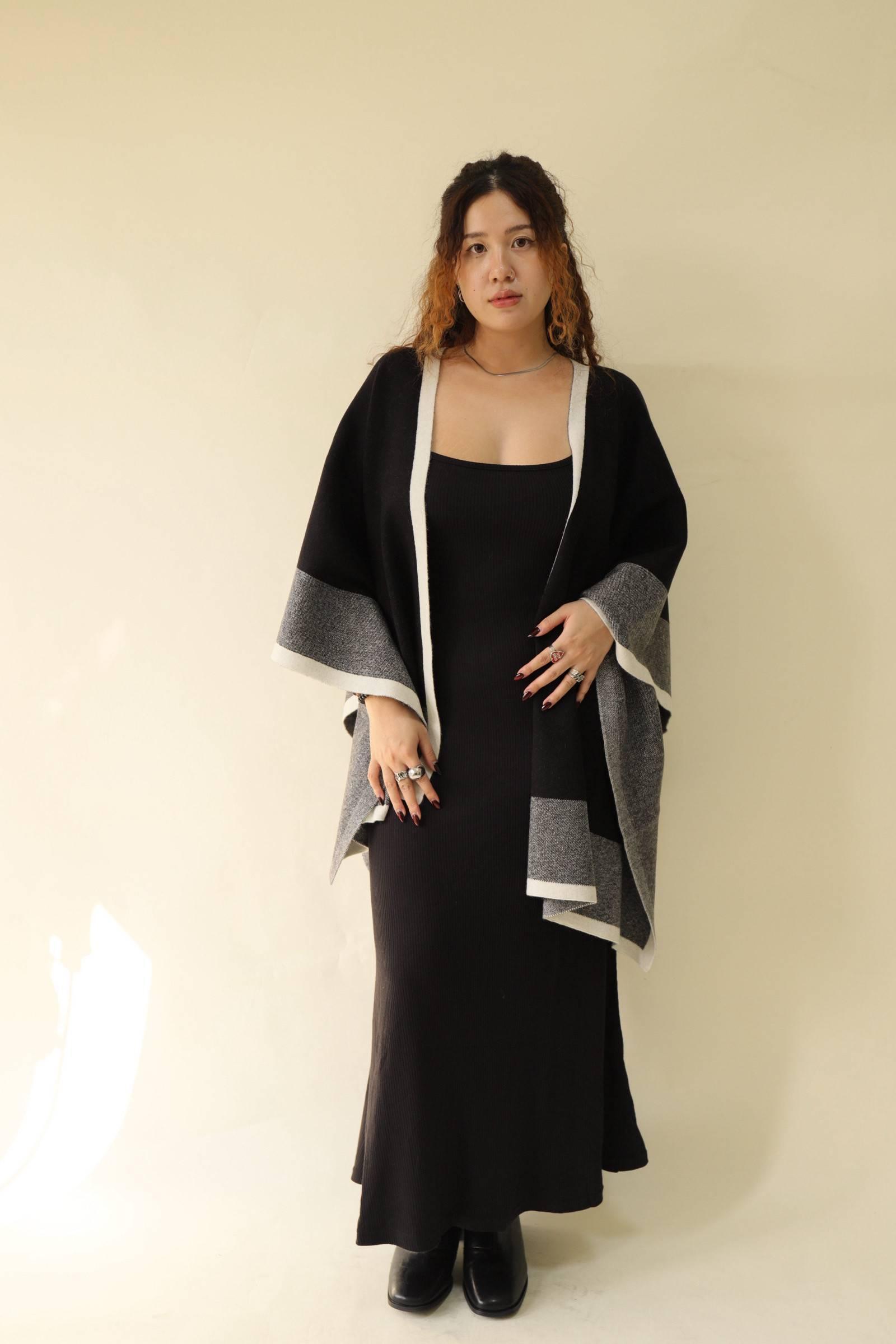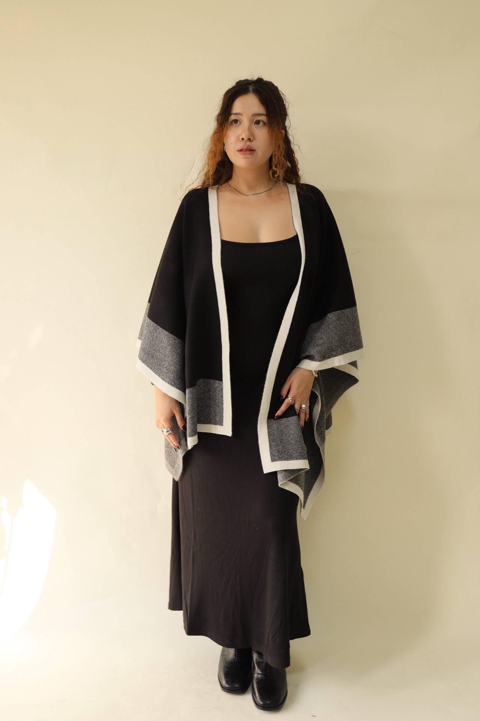 【門市試穿品】老錢風針織撞色斗篷披肩 (黑)