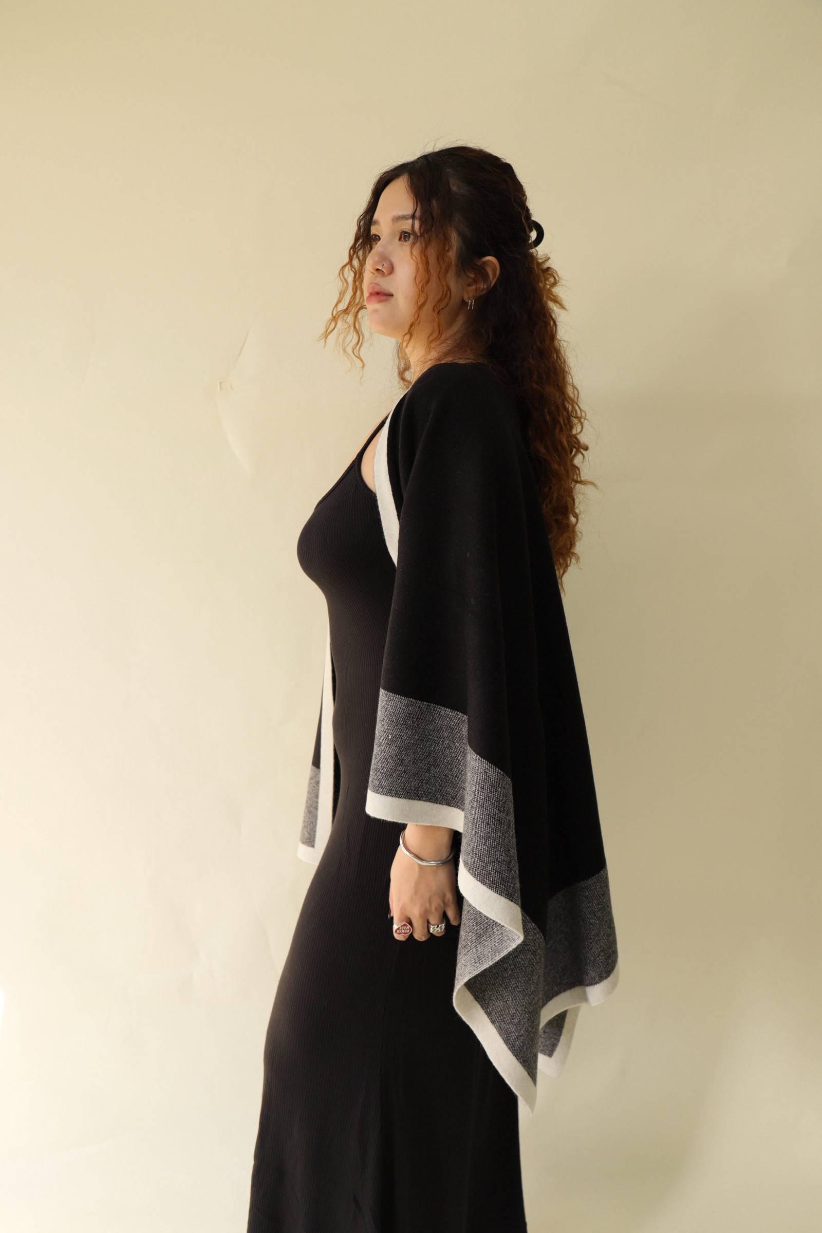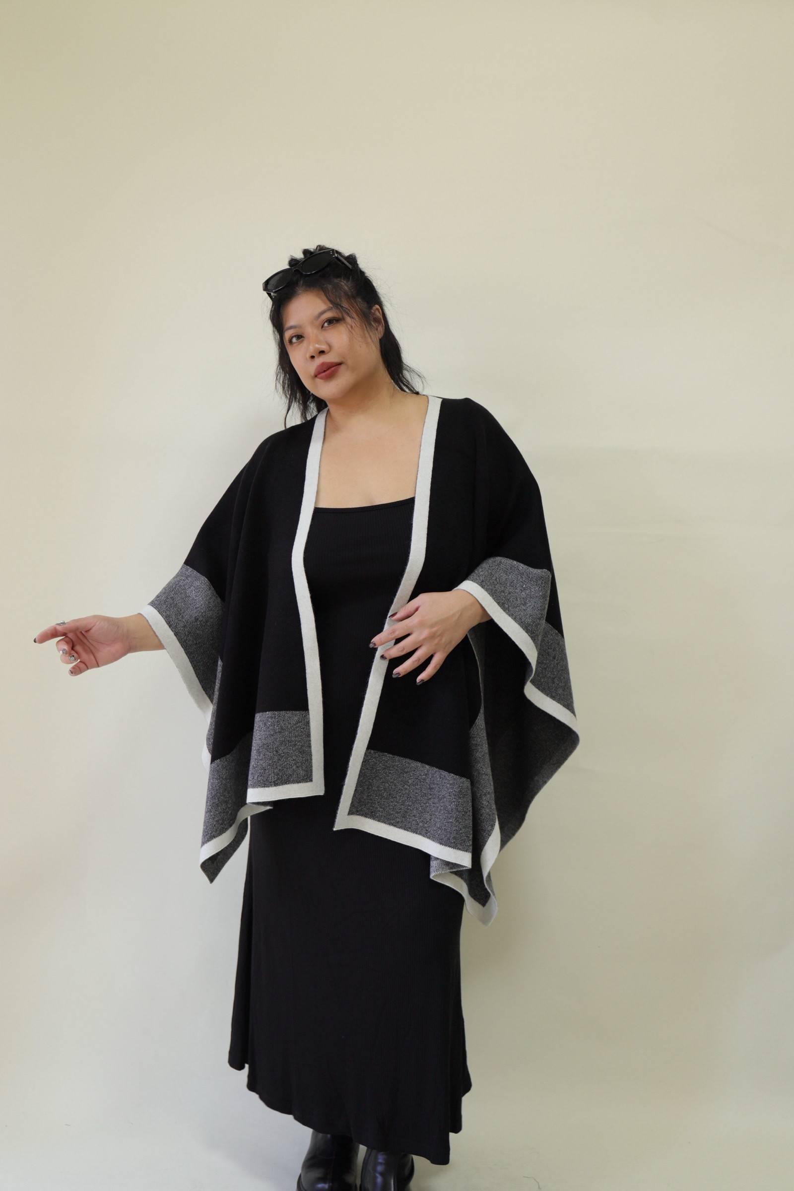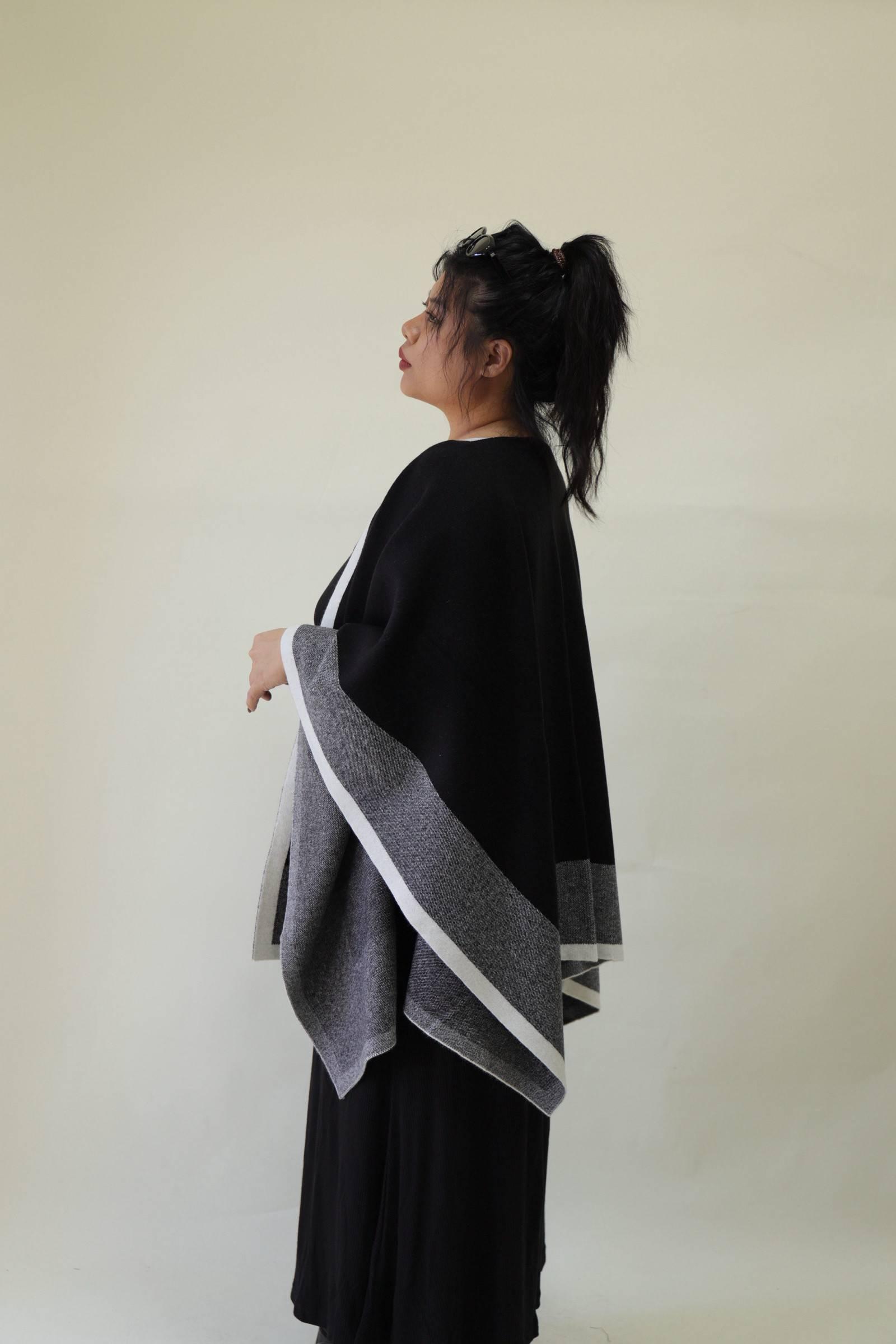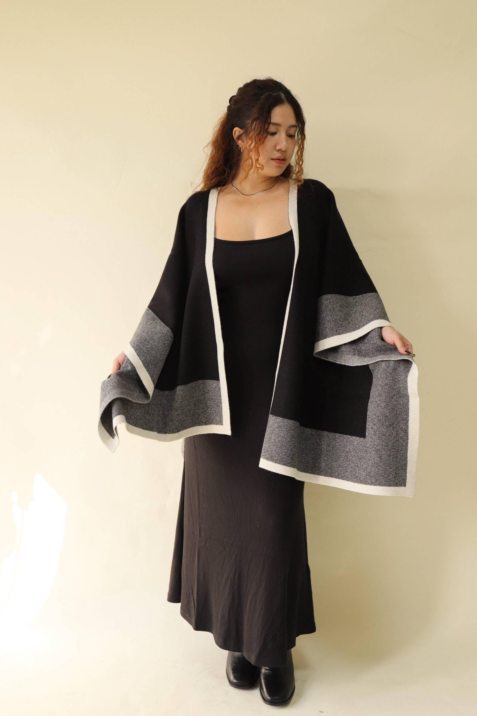 【門市試穿品】老錢風針織撞色斗篷披肩 (黑)